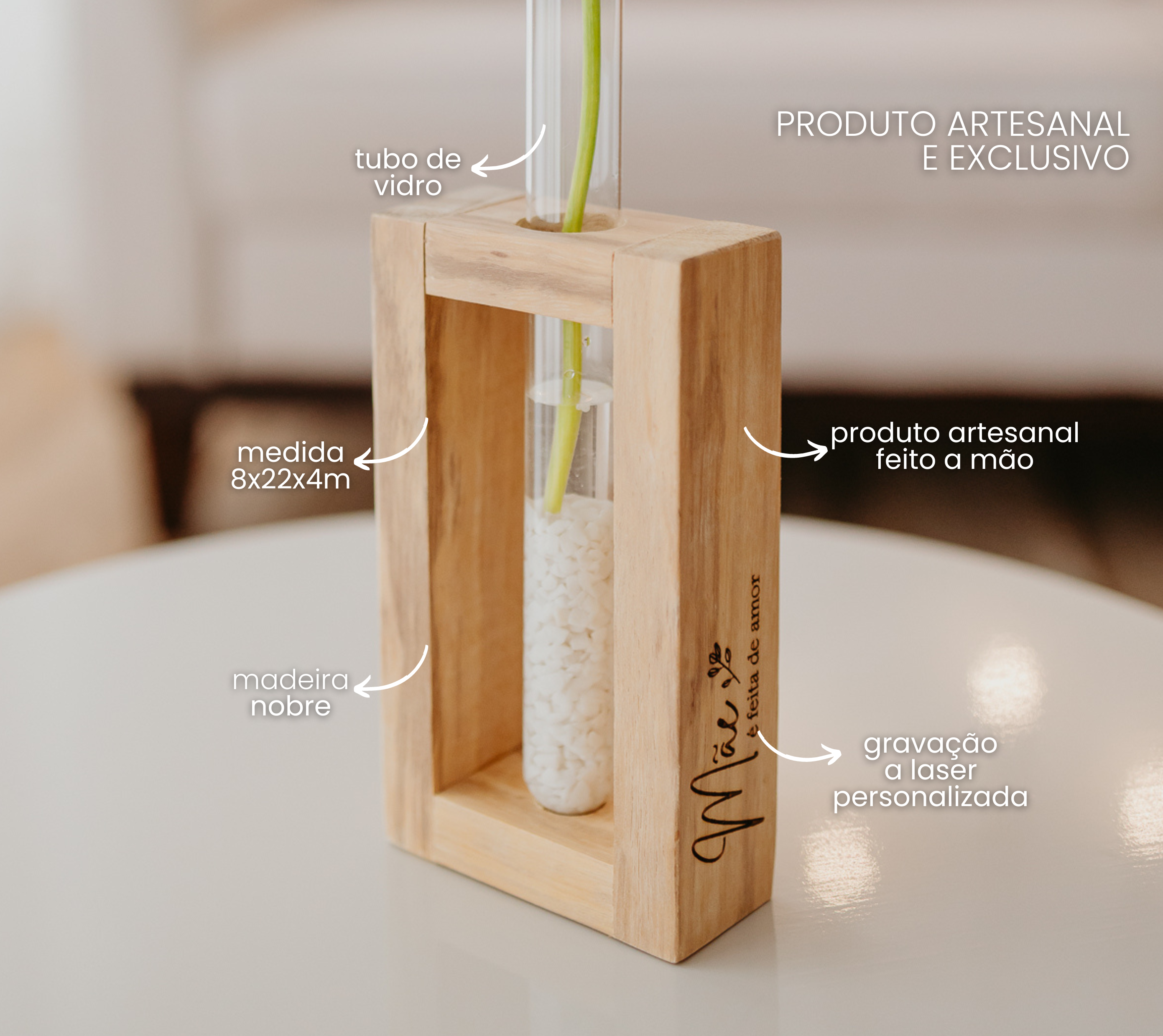 Produzido cuidadosamente a mão em madeira nobre com acabamento e durabilidade impecáveis. O uso da madeira tauari, conhecida por sua resistência e beleza natural, traz delicadeza e elegância para a peça. Além disso, nossa técnica de gravação a laser permite uma personalização precisa e detalhada, garantindo delicadeza e nitidez.